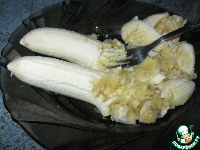 Перемешать, ввести банановое пюре, молоко с соком и шоколад.