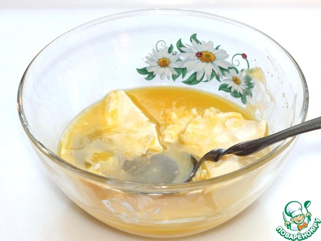 В другой миске смешиваем яйца, лимонный сок, сахар и мягкое сливочное масло. Хорошо перемешаем.