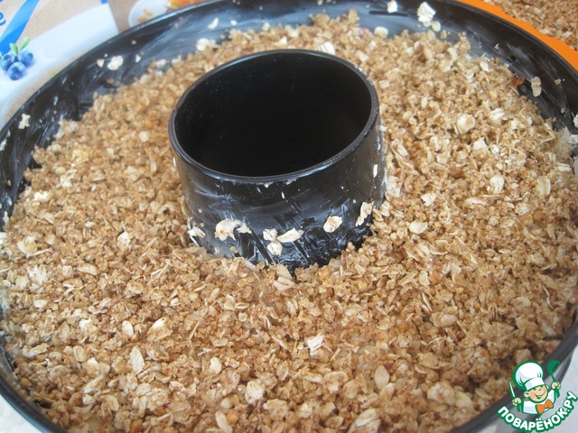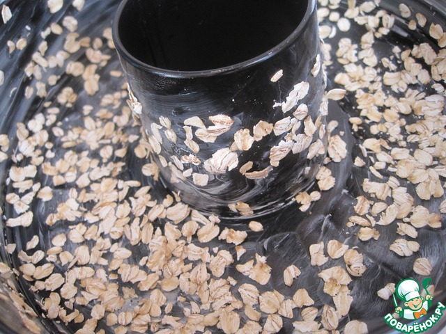 Тесто готово. Включаем духовку на разогрев t 180-190 градусов. Разъёмную форму смазываем сливочным маслом и посыпаем овсяными хлопьями.