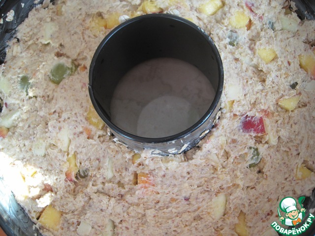 В творожно-яичную массу вмешаем ложкой сначала сухую смесь, а затем и фрукты.