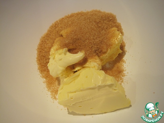 Для теста взобьём миксером размягчённое масло с коричневым сахаром и ванилином до пышности.
