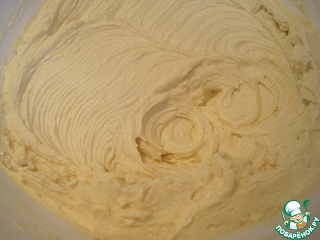 Продолжая взбивать, добавим по одному яйца, затем творожный сыр. Получится гладкая, воздушная масса.