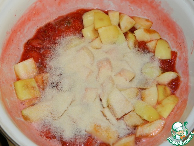 Добавить нарезанные яблоки и желатин в горячую клубнику. Размешать и убрать в холод на 1 час для застывания.