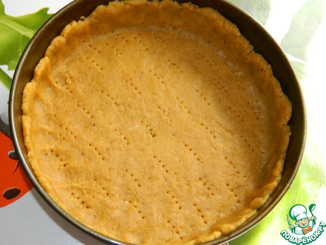 2/3 теста распределяем по дну формы ( у меня 24 см), формируя бортики. Накалываем тесто вилкой.