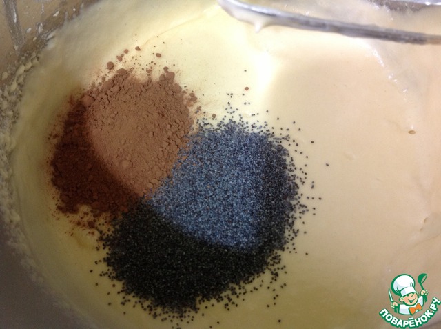 Тесто делим на две части. В одну кладем какао и мак, перемешиваем
