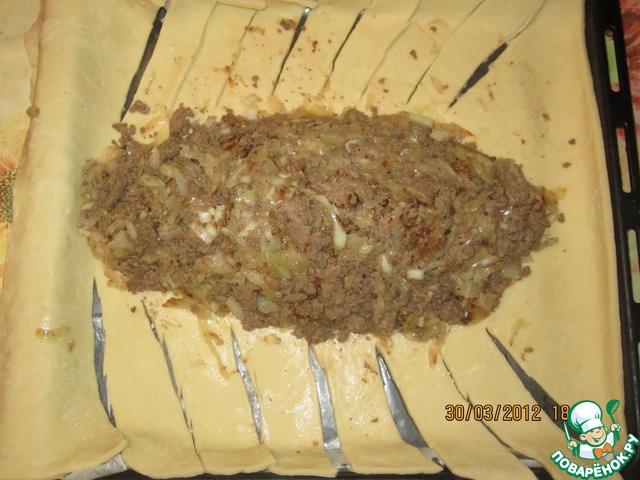 Раскатываем прямоугольный пласт теста, ровно обрезаем. Навертываем на скалку и переносим на противень, застеленный смазанным маслом пергаментом. На середину компактно выкладываем начинку.