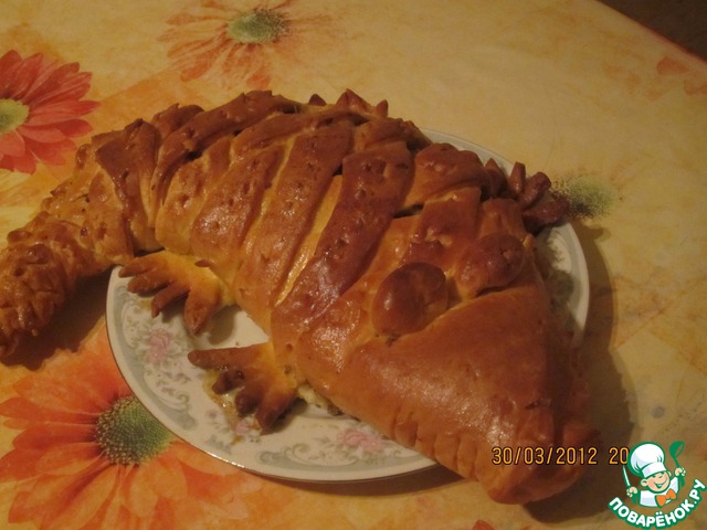 Из верхней части складываем голову, а из нижней-хвост крокодила. Формируем ноздри у крокодила, из обрезков теста лепим лапки и глаза-брови. Делаем ножницами по краю челюсти клыки и создаем по всему телу неровности. Выпекаем в разогретой духовке при 200 градусах до красивого подрумянивания. За 10 мин. до готовности смазываем разболтанным яйцом.