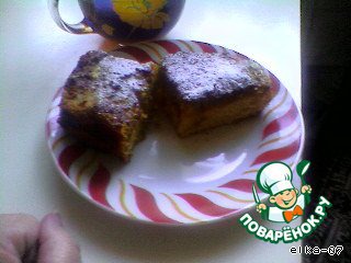 Готовый пирог вынуть из духовки, остудить посыпать сахарной пудрой или тертым шоколадом и нарезать на порции. Вместо апельсинов можно использовать крупные лимоны, орехи - любые, какие есть в наличии.