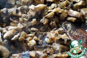 Для грибной начинки мелко режем лук и грибы произвольно. На растительном масле обжариваем до испарения влаги и легкого подрумянивания.