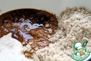 Теперь тесто. Смешать два вида муки, рыхлитель, соль. Добавить растительное масло и кофе. Кофе, на котором замешивается тесто, усиливает ржаной аромат. Но можно кофе не добавлять, а замесить тесто на воде.