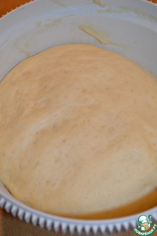 Когда опара увеличиться вдвое, добавить в нее растопленное масло и перемешать. Яйца слегка взбить вилкой и добавить к тесту, всыпать соль и сахар, затем вымешивать, постепенно добавляя к тесту остальную муку. Тесто не должно липнуть к рукам. Посуду с тестом накрыть полотенцем и оставить для расстойки. Когда тесто поднимется обмять его и снова дать подойти.