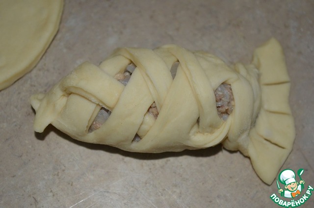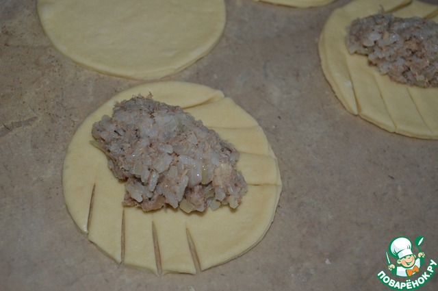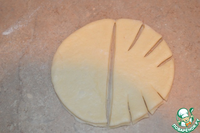 В середину кружочка положить начинку и сделать по четыре надреза с каждой стороны.
