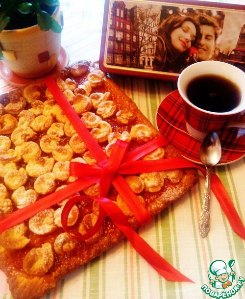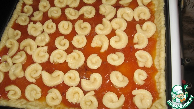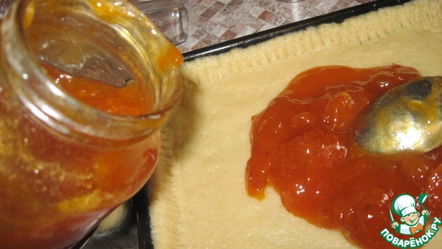 Раскладываем их поверх джема и ставим пирог в разогретую духовку.