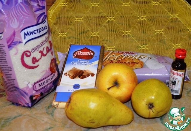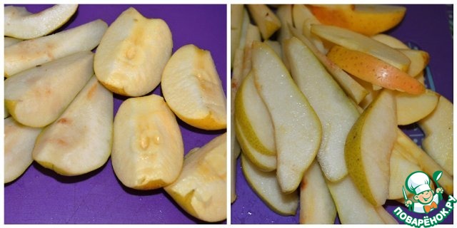 Груши и яблоко порезать на 4 части, удалить сердцевинку и нарезать тонкими ломтиками. Сбрызнуть ликером.