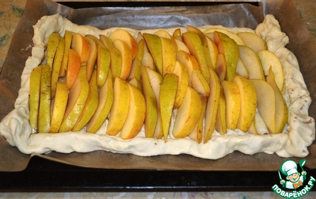 Поверх теста красиво выкладываем дольки фруктов и отправляем в разогретую до 200 градусов духовку на 30 минут. Через 30 минут включаем верхний режим и подрумяниваем пирог.