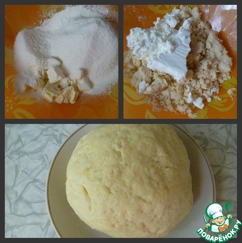 Сливочное масло раскрошить и смешать с мукой, разрыхлителем, солью, сахаром. Добавить творог. В оригинальном рецепте не добавляют яйцо, я все же добавила желток (на фото яйца нет), а белок оставила для заливки.