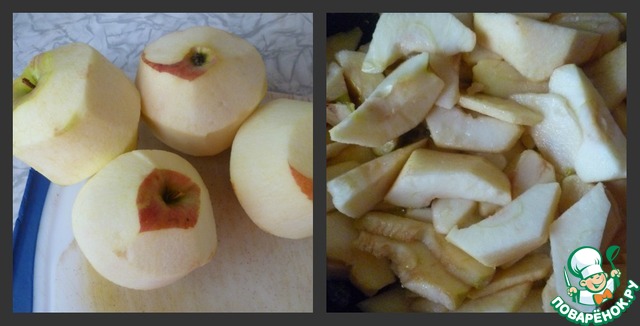 Яблоки вымыть, очистить от кожуры и нарезать небольшими кусочками. Одно яблоко нарезать на 8 частей и оставить его для украшения.