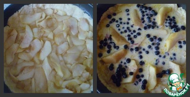 Форму с тестом достать из духовки, температуру увеличить до 200 градусов. Вылить заливку на пирог, выложить дольки яблок и ягоды (у меня черника).