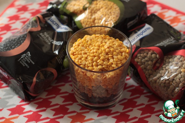 Я использовала 3 вида чечевицы - черная и зеленая (они сохраняют свою форму при варке) и желтая, она разваривается и соединяет чечевицу вместе. Всю чечевицу промыть, выложить в кастрюлю и залить водой 1:2, варить 15 минут.