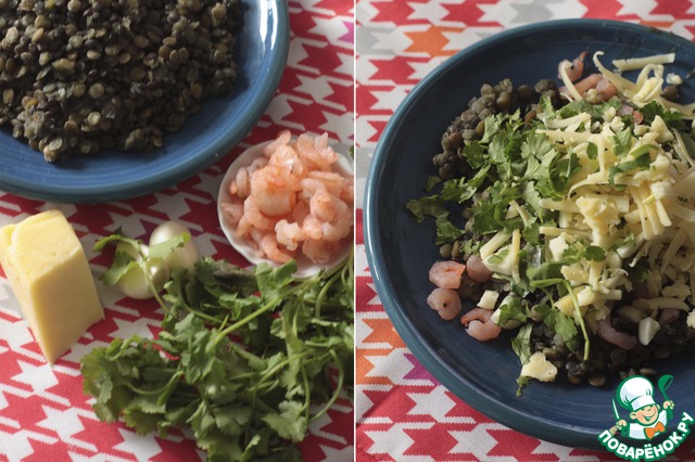 Приготовим начинку: соединим чечевицу, размороженные очищенные креветки, выдержанный чеддер (если планируете готовить пироги в пост, то сыр не кладите), 2 зубчика чеснока и кинзу.