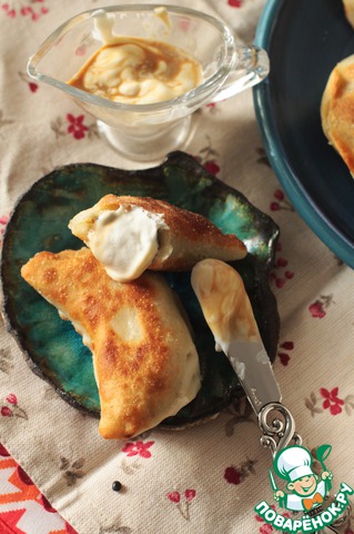 Раскатайте тесто, вырежьте круг, на одно половину выкладывайте начинку и закрывайте другой половиной.