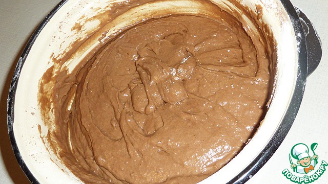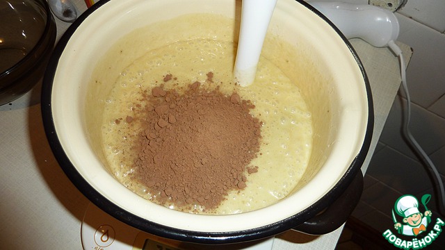Постепенно добавляем какао, гашеную соду, щепотку соли и муку.