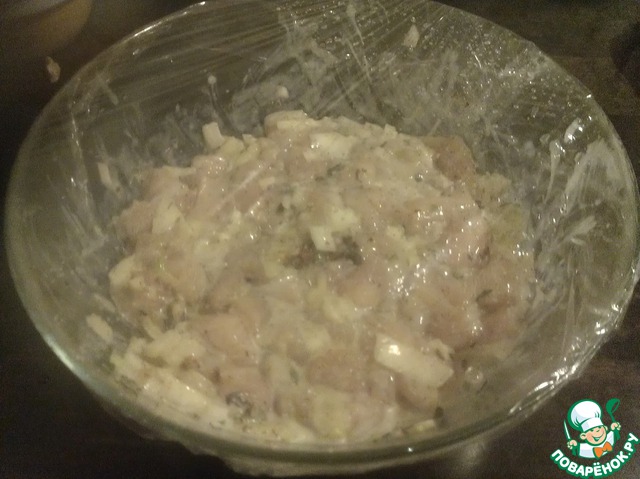 Смешиваем в миске нарезаную кубиками курочку, йогурт, специи, соль, перец, мускатный орех, джусай, накрываем пленкой и ставим в холодильник (я убрала на ночь, но можно и всего на час-полтора).