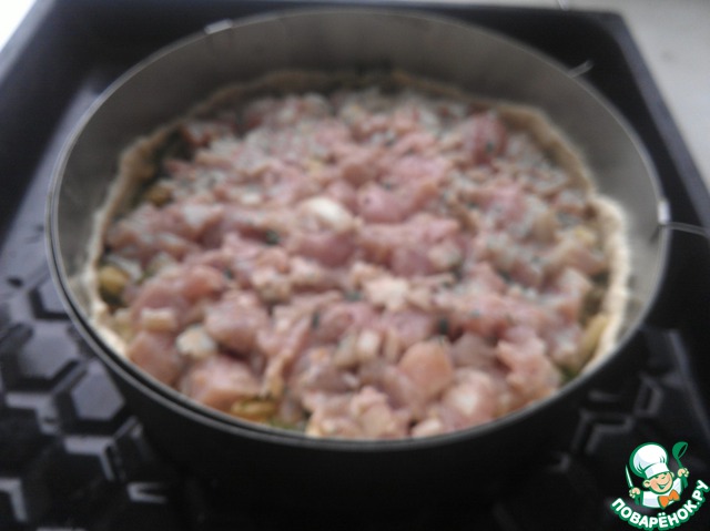 Раскатываем 2/3 теста в круг, на пару см больше предполагаемого диаметра формы (у меня диаметр был около 23 см, но мое кольцо я регулировала по ходу, как мне было удобно), выкладываем в форму, заполняем картофелем и мясом.