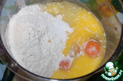 Добавить масло, муку, сахар, молоко, соду, яйца, соль.