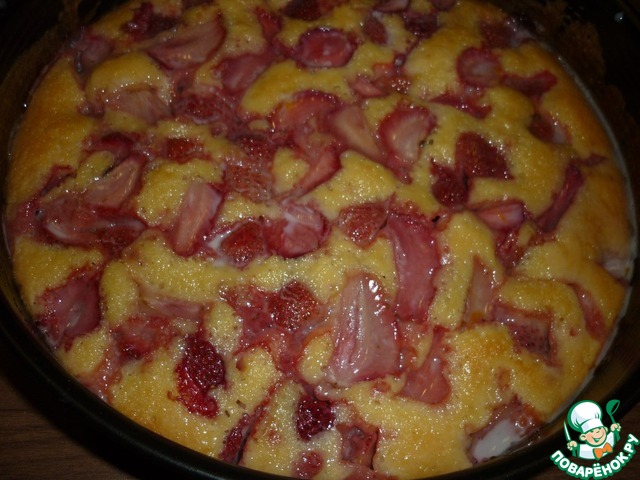 Тесто выкладываем в форму для выпечки, смазанную сливочным маслом, и разравниваем. Клубнику немного измельчаем (я разрезала на 4 части) и выкладываем на тесто.