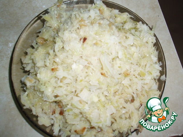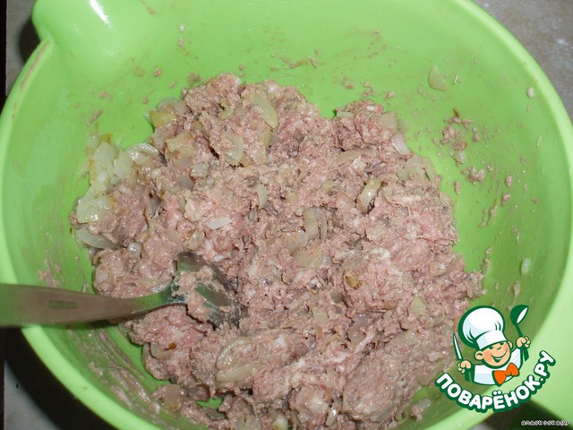 Начинка: печенку отварить и пропустить через мясорубку вместе с сырым мясом, добавить обжаренный лук, соль, перец