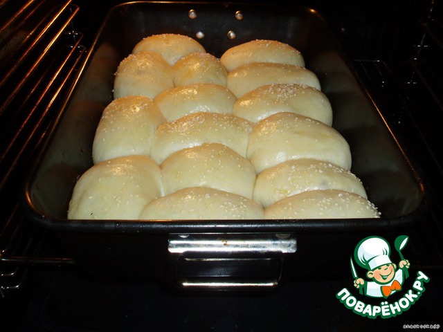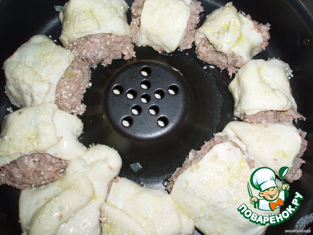 Выкладываем в смазанную сковородку и мажем верх яйцом и обсыпаем кунжутным семенем.