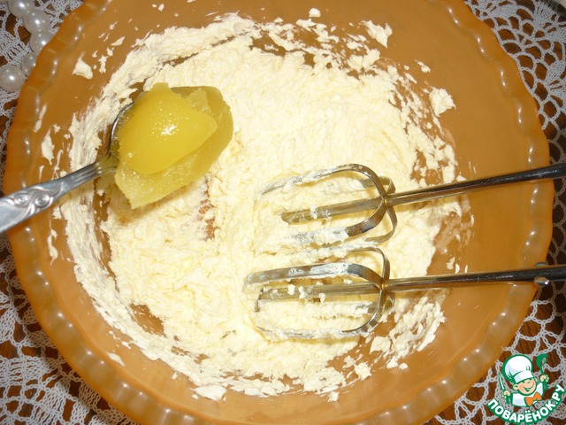 Размягчённый маргарин, сахар, яйцо смешать миксером. Добавить мёд и гашёную соду. Смешать.
