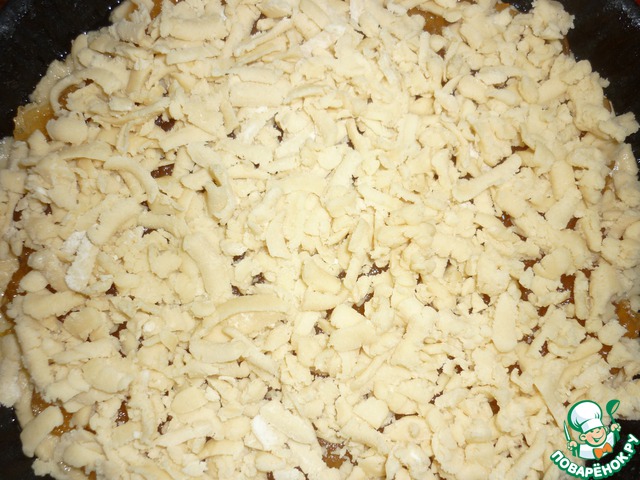 Большую часть раскатать и перенести в форму. Положить начинку. Достать из морозилки шарики и натереть на крупной тёрке поверх повидла.