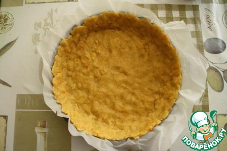 Растираем с мукой до состояния маслянистой крошки. Затем добавляем цедру одного апельсина, сахарную пудру, желтки, семена ванили и молоко. Замешиваем. На форму кладем пергамент, тесто раскатываем, укладываем на дно формы, формируя бортики. Ставим на час в холодильник