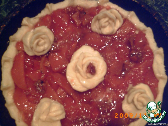 2. Форму смазать маслом и выложить тесто, на середину положить варенье (кто сколько любит начинки), на варенье - розы, слепить из этого же теста. Выпекать 20 -30 мин.