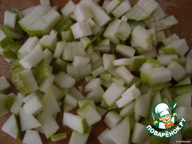 Грушу нарезать мелким кубиком, и смешать с маком, добавить крахмал, взбитые белки и перемешать.