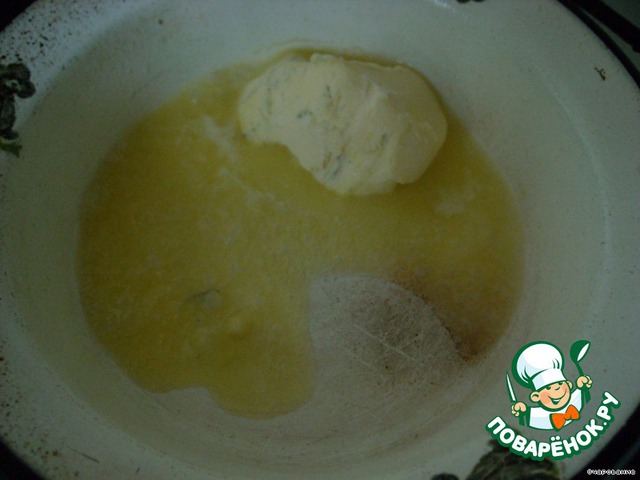 Масло растопить и смешать с молоком, влить коньяк, добавить желтки и смешать с мукой.
