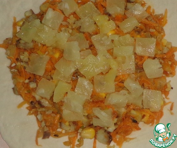 Тесто раскатать в круг. На середину выкладываем начинку и сверху е посыпаем кусочками ананасов.