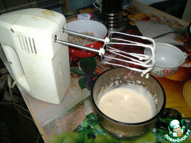 Белки взбиваем с сахарной пудрой. Сколько не пеку этот пирог, каждый раз разное безе получается. Вы на правильном пути, если ваша смесь получается густовата. Заливаем ею наш пирог.