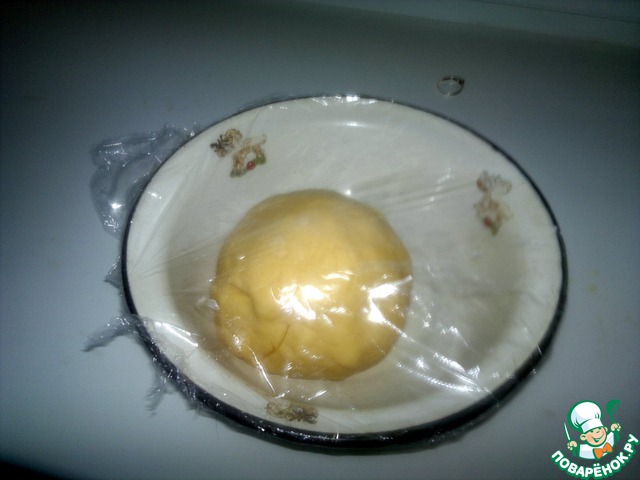 К сожалению, фото данного этапа я забыла сделать.. Масло протираем с мукой в крошку (желательно без комочков). Теперь добавляем туда наши взбитые желтки с сахаром и соду. Смешиваем, должен получится вот такой комочек теста. В оригинале песочное тесто желательно положить в холодильник на час, но я так не делаю. Вкус не меняется.