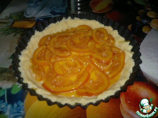 Укладываем наше тесто в форму (не смазывать). Делаем бортики (иначе наша начиночка вытечет и подгорит). Выкладываем варенье. ВНИМАНИЕ: лучше брать густое варенье (смородина, к примеру), но НИКАК НЕ КЛУБНИЧНОЕ. В моем случае это апельсиновое варенье. И то, я отжимала лишний сок. Так как из-за этого "сока" тесто очень промокает (что не есть хорошо) и весь смысл теста теряется.