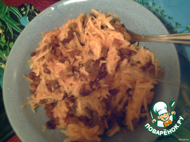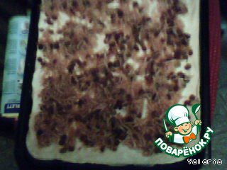 Предупреждаю сразу, фото теста не получилось, "смазалось", но я постараюсь подробно написать. Просеять муку через сито в кастрюлю, туда же разбить яйцо, молоко с водой, сахарный песок, дрожжи и масло. Хорошенько перемешать (тесто должно быть жидковатым), закрыть крышкой и накрыть полотенцем, поставить в теплое место (я ставлю на плиту, когда грею духовку) и дать постоять минут 20. Через 20 мин. открыть, обмять, чуть присыпать мукой и тесто готово (можно дать ещё постоять). Смазать руки растительным маслом (чтобы тесто не липло) и хорошенько его помять, только с любовью, нежно. Затем разделить на 2 части, взять одну часть, подсыпать немного муки и раскатать в слой примерно 1,5см, уложить его на противень. Приготовить начинку. Взять яблоки, вымыть, очистить от кожуры и натереть на крупной терке, добавить предварительно вымоченный изюм и творог (можно добавлять сразу в тесто, и так и так вкусно), выложить начинку на тесто и разровнять.