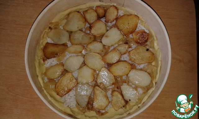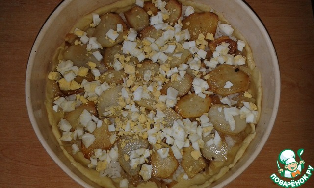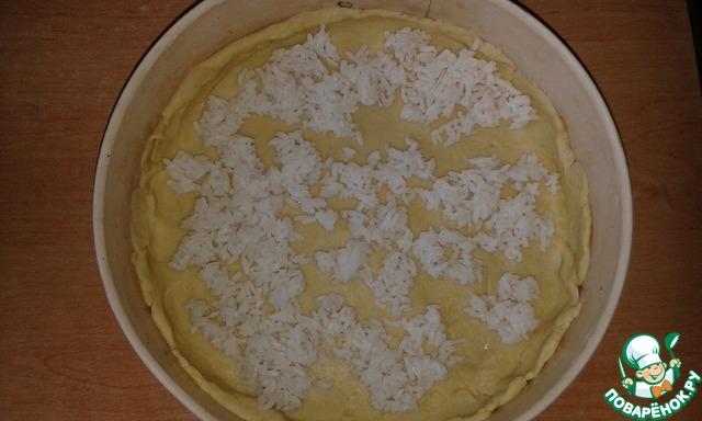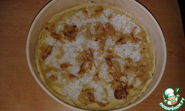 Для начинки сварить рис, лук и картофель, нарезанный тонкими пластинами, обжарить по отдельности на растительном масле. Яйца сварить вкрутую и порезать кубиками. Сыр натереть на терке. Охлажденное тесто разделить на 2 неравные части. Большую часть раскатать по размеру форму и уложить, формируя бортики