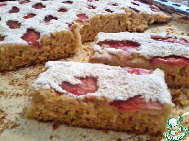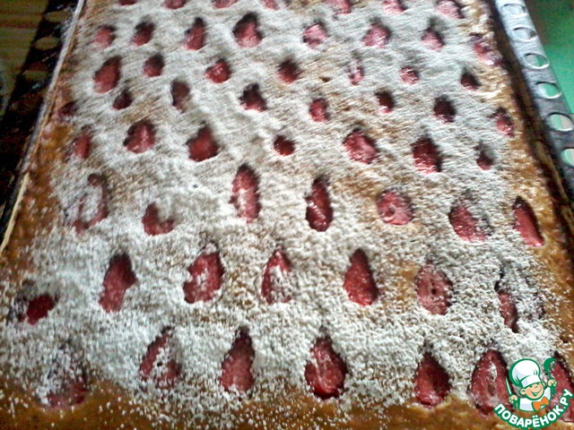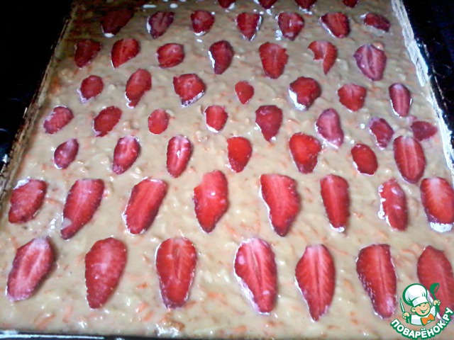 8. Сверху выкладываем порезанную клубнику, одну сторону которой обмакнуть в крахмал.