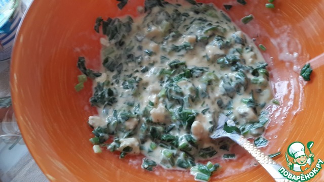 Обжарить мелко нарезанный лук и шпинат и смешать с яичной смесью.