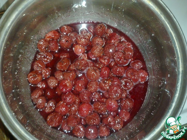 В кастрюльку кладём вишню с сахаром. На маленьком огне доводим до кипения.