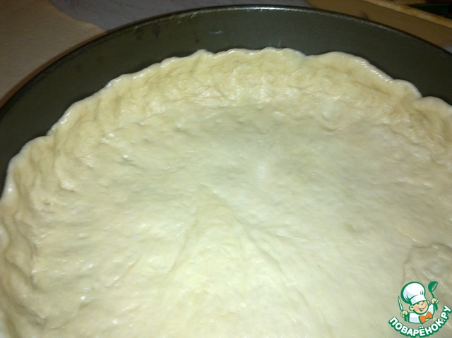 Тесто раскатываем толщиной 0,5см. Не большой кусочек теста оставляем для украшения. Выкладываем раскатанный пласт в смазанную маслом разъёмную форму. При этом делаем бортик высотой 2-3см.