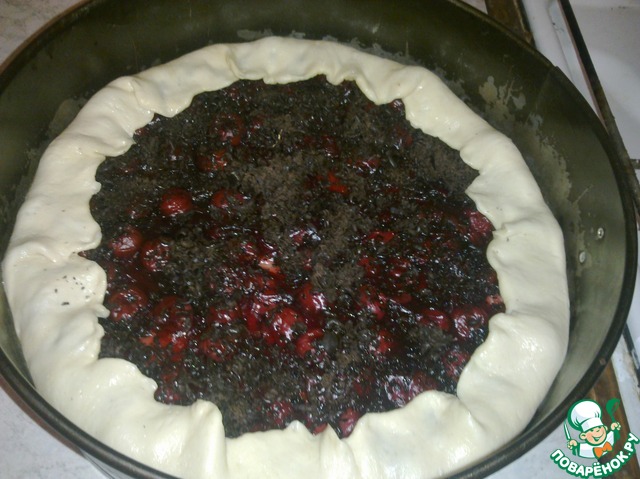 Полностью остывшую вишню выкладываем на тесто. Обильно посыпаем шоколадом.