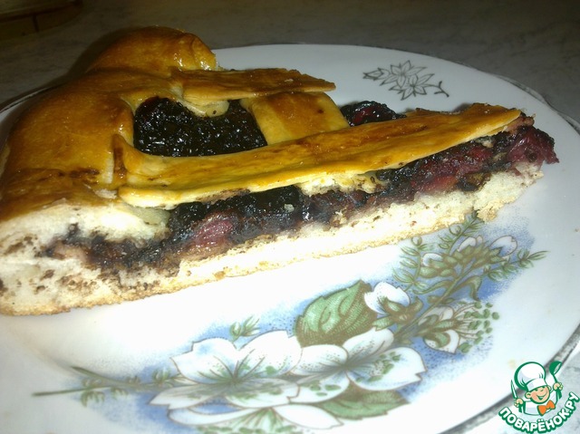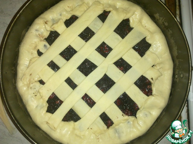 Вспоминаем про маленький кусочек теста. Делаем из него тоненькие полосочки и выкладываем на пирог в виде сетки. Можно сделать косички. У кого какая фантазия и настроение))) Смазываем наш пирог яичным желтком и отправляем в разогретую духовку на 30 мин.